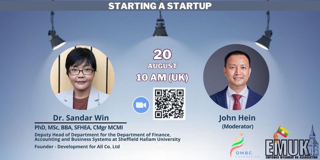 Sandar is an executive member of the newly founded Overseas Myanmar Business Community (OMBC) and Empower Myanmar UK (EMUK). She is currently working with OMBC in the development of entrepreneurial ecosystems for Myanmar migrant entrepreneurs in the UK and beyond.